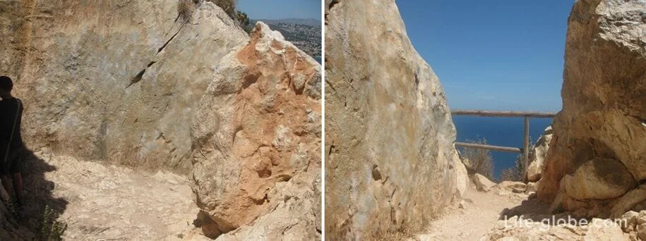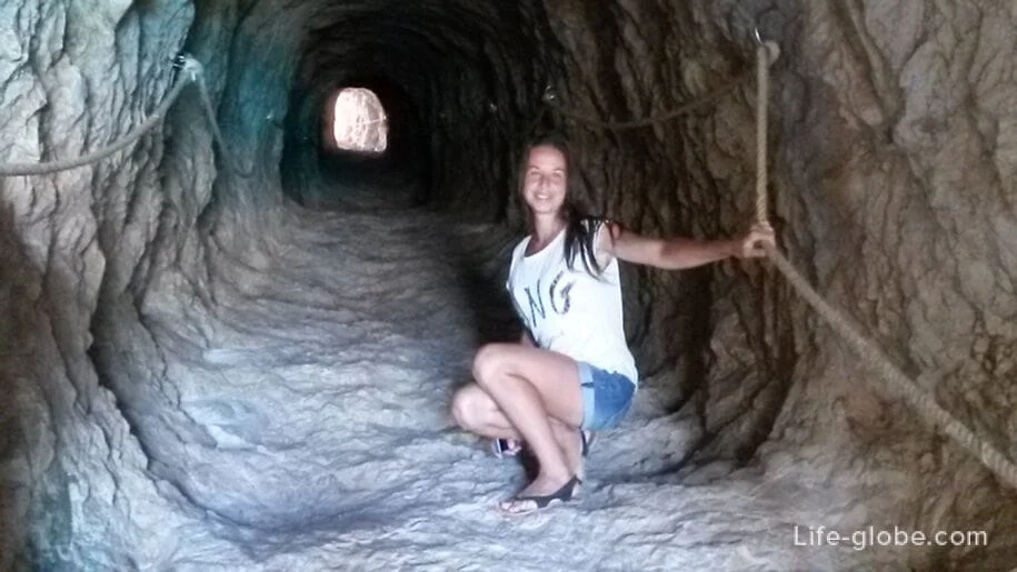 Вот здесь многие разворачиваются и дальше уже не идут. Но мы-то с вами идем? Правда, же! Здесь находится пещера-тоннель. Пещера представляет собой тоннель, ведущий на противоположную сторону скалы. Путь в сторону моря удобный, а вот обратно будет идти темно и не очень удобно, камни отпарированы до блеска тысячами туристов. Именно для этого участка пути и дальше мы советовали надеть кроссовки. С обеих сторон тоннеля натянуты канаты, за них удобно держаться и идти.