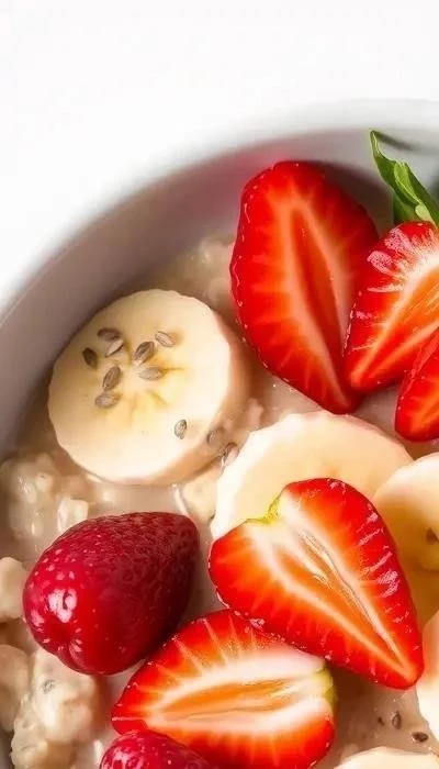 Ингредиенты: 50 г овсяных хлопьев, 150 мл молока (или воды), 100 г ягод (свежих или замороженных), 20 г орехов (миндаль, грецкие орехи, фундук), 1 ч.л. меда (по желанию).