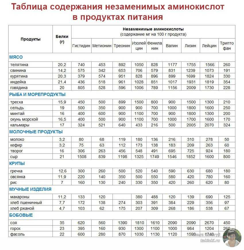 Содержание незаменимых аминокислот в продуктах питания