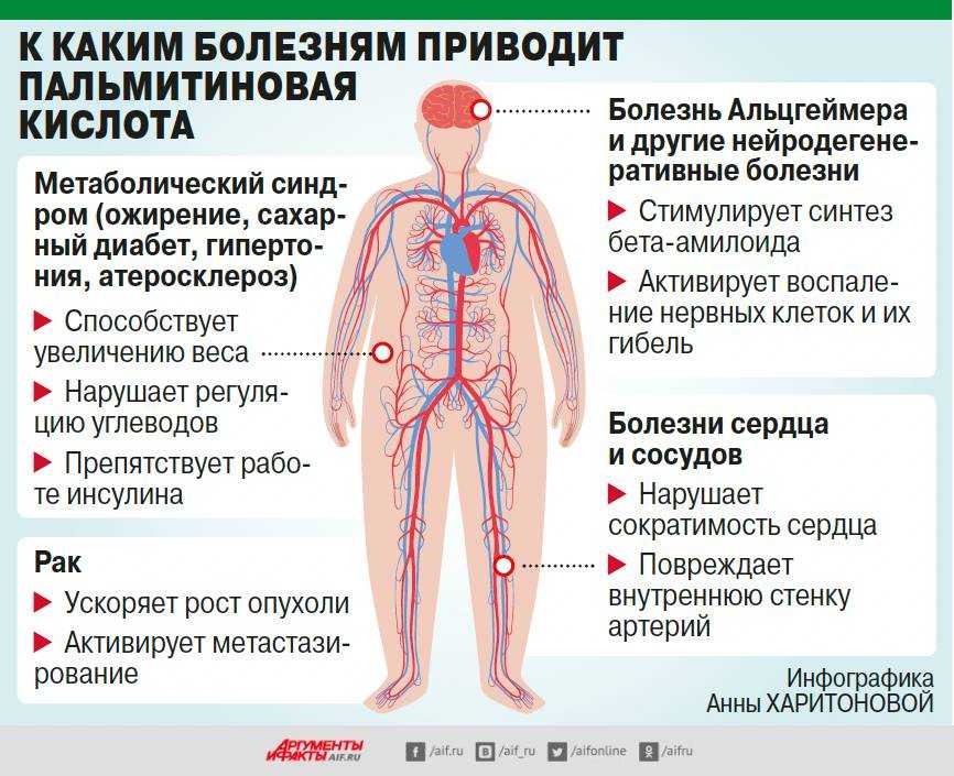 Причём вредно это не только из-за рака. Немало исследований показывают, что пальмитиновая кислота способствует развитию и иных заболеваний. Группа китайских учёных из Гонконга в 2019 г. подготовила обзор таких работ и сделала вывод: «Пальмитиновая кислота среди всех насыщенных жирных кислот уникальна своей ролью в развитии метаболического синдрома, сердечно-сосудистых болезней, рака, нейродегенеративных заболеваний и воспаления» (см. инфографику). Это объясняют тем, что она способна вмешиваться в регуляцию разных процессов в клетке, приводя к негативным последствиям. Учёные призывают больше изучать эти механизмы, так как они могут привести к созданию новых лекарств.