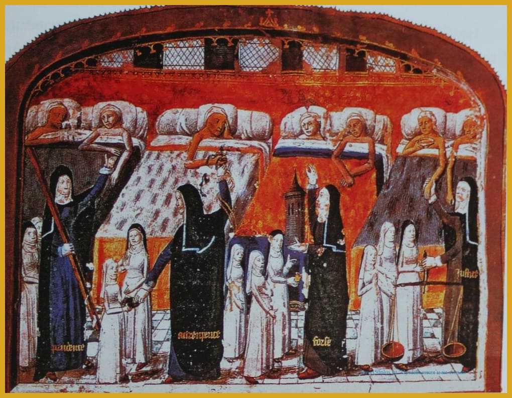 Миниатюра 16-го века «Пациенты и сестры милосердия в госпитале».