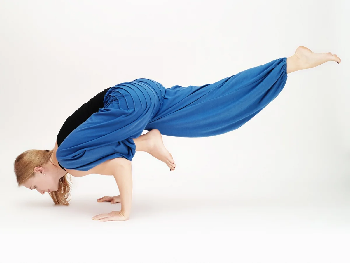 Еще одно усложнение – Эка Пада Бакасана. Из конечной позы Бакасаны выпрямите ногу и тяните ее вверх. Держите на протяжении нескольких вдохов-выдохов и повторите с другой ноги.