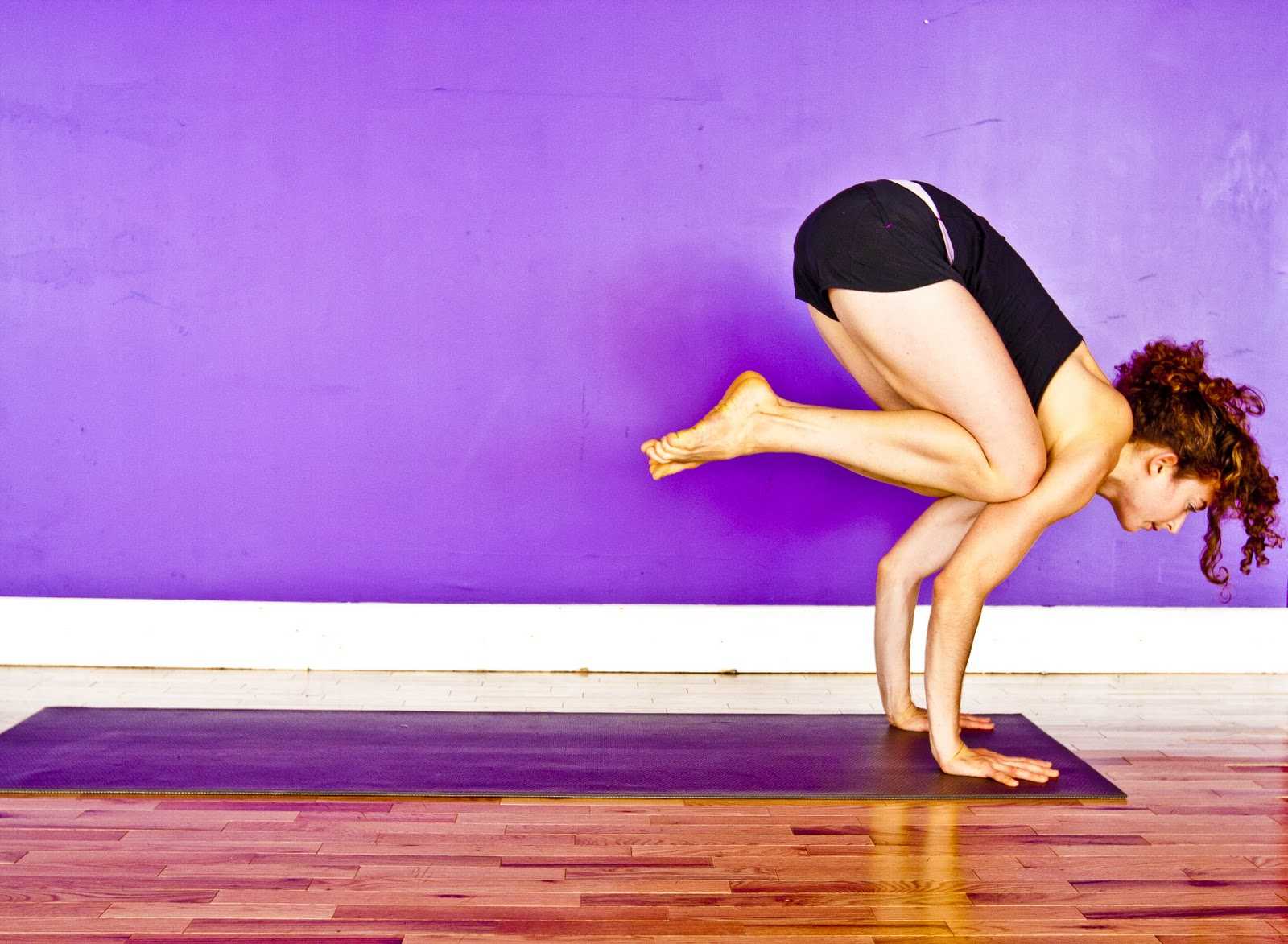 Бакасана — это база для многих других балансов на руках. Как правило, эту практику изучают одной из первых, потому что в этой позе тело симметрично, а колени согнуты, поэтому требуется меньше гибкости. Бакасана — отличный способ почувствовать первый намек на ощущение полета. Один из распространенных промахов — это позволить ягодицам зависнуть в воздухе слишком рано. Это может произойти, когда вы будете опускать голову и грудь вниз, так как ноги легче поднять, когда передняя часть тела опускается. Использование стены для поддержки головы поможет держать ваш взгляд впереди рук и тянуться сердцевиной, не позволяя ягодицам подниматься слишком высоко.
